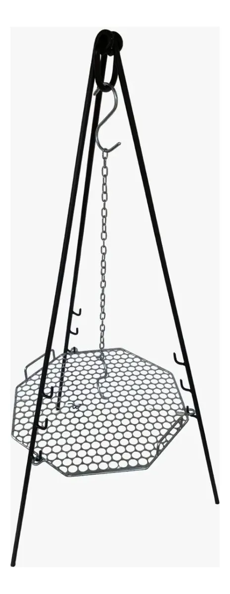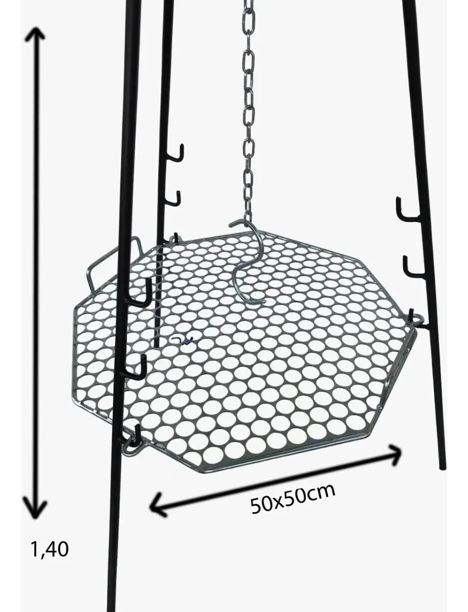 Trempe com Grelha de Ferro Pintada 3 Andares Grelha Removível Gancho e corrente incluso Altura: 140cm Diâmetro da grelha: 50cm Tripés em aço maciço de 1/2 polegada (12.7mm) Grelha em aço maciço de 5/16 polegada (7.9mm)